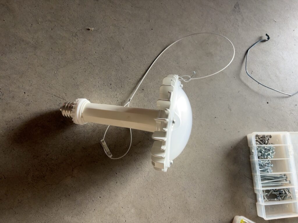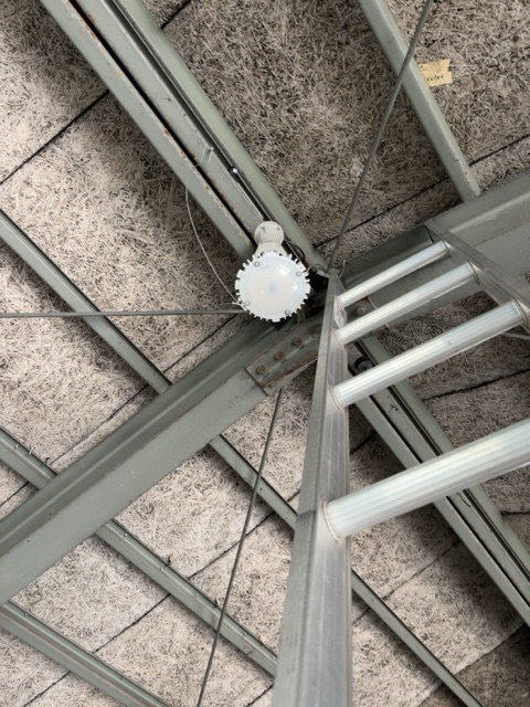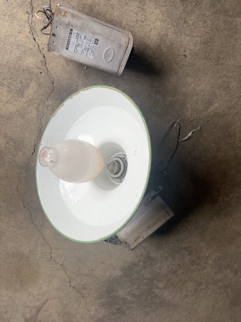 高天井用のLEDランプ 仕事 2026.04.22 倉庫の高天井に設置されている水銀ランプをLEDランプへ入れ替え工事させていただきました。 これまで使われていた水銀ランプですが、現在は製造・輸出入が禁止されています。 長年使われていた水銀ランプは、点灯までに時間がかかったり、明るさが落ちてきている状態でした。 これから交換するLEDランプ 今回は新しい照明へ交換し、点灯もスムーズでしっかり明るさも確保できました。 倉庫内もパッと明るくなり、作業効率もアップしそうです。